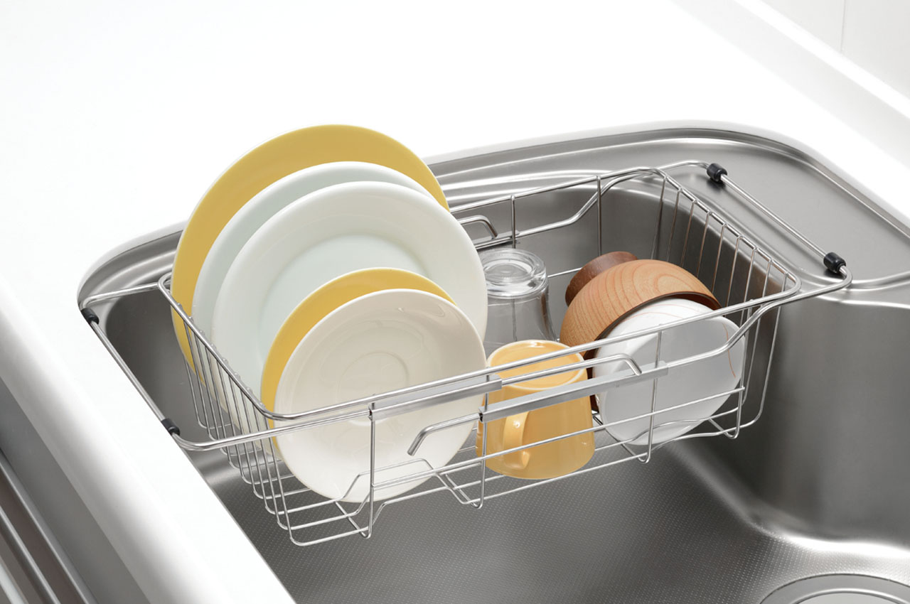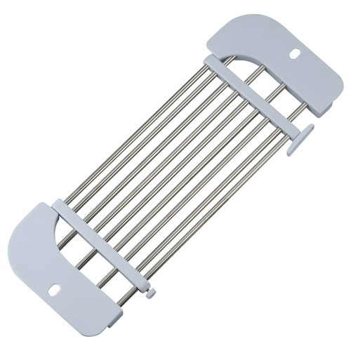 These are dish drying racks that can be hung on the edge of the sink. When not in use, they can be folded, and some models are extendable to fit the sink, making efficient use of space.