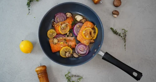 - コンロ(中火)でフライパンを熱し、サラダ油をひいてスライスした玉ねぎを炒める。