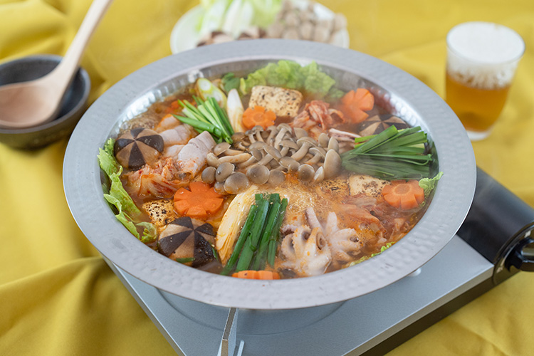 (※レシピ画像では人参と椎茸を飾り切りにしています) - 2 よせしゃぶ鍋に白菜を敷き、その上にキムチ、イイダコ、手順1で切り分けた食材を乗せていく。(ニラ以外)【A】の調味料をすべて加え蓋をし、火にかける。