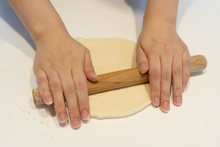 オーブンを230℃に予熱しておく。発酵が終わったら一度ガス抜きをする。打ち粉(分量外)をし、綿棒を使いグリさらパンより少し大きめに生地を伸ばす。