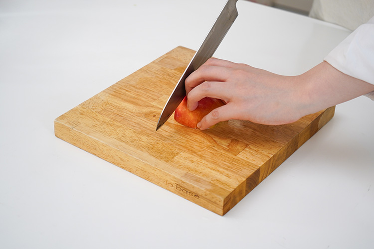 りんごは芯を取り除く。皮付きのままトッピング用にスライス2枚を取り分け、残りをひと口大に切る。にんじんも同様に、皮付きのままひと口大に切る。オレンジは皮をむき、果肉を取り出しておく。